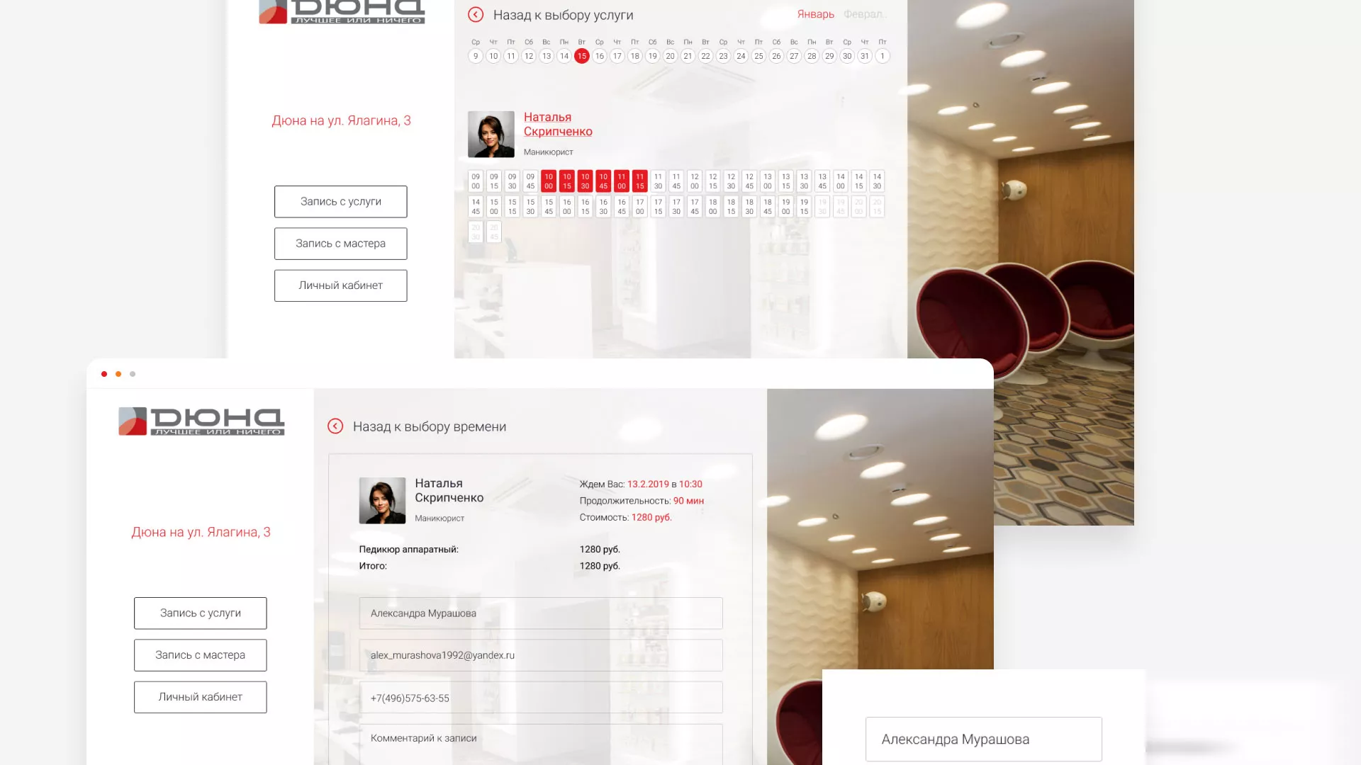 В разделе «Личный кабинет» содержатся все текущие записи в салоны красоты в Суворове, с возможностью их отмены. Также, здесь можно редактировать свои персональные данные, ознакомиться с историей записей и видеть бонусы и акции салонов красоты.